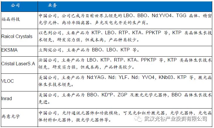 激光晶体领域的主要参与者包括福晶科技(FY17 4.54亿收入,1.41 净利润;FY18 4.91亿收入 1.53 净利润)、美国贰陆、诺斯洛普-格鲁门公司、美国科学材料公司、激光材料公司、Raicol Crystals、EKSMA、CristalLaser S.A、VLOC、Inrad、高意光学等。福晶科技是世界领先的激光晶体公司,目前可以算是激光晶体领域的龙头,收入规模一致在5亿元以下。