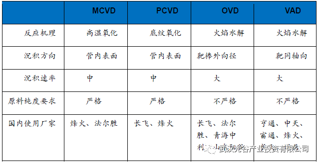 芯棒普遍采用四种方法:改进的化学气相沉积法(MCVD)、轴向气相沉积法(VAD)、棒外化学气相沉积法(OVD)和等离子体化学气相沉积法(PCVD)四大主流工艺。