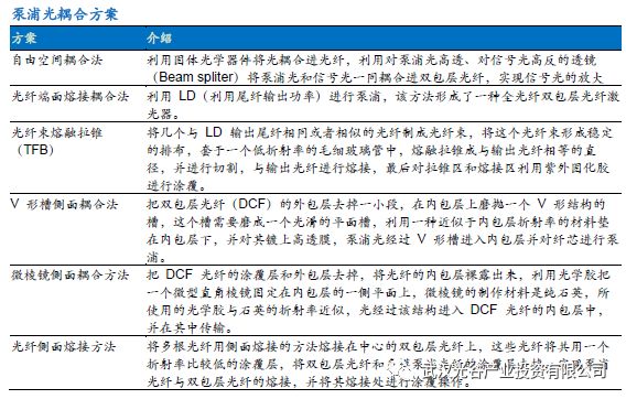 泵浦光进入光纤中有两种方式:端面泵浦和侧面泵浦,其中主要方案包括6种:自由空间法、光纤端面熔接法、TFB(Taper Fiber Boundle)、V 形槽侧面耦合法、微棱镜侧面耦合泵浦法、光纤侧面熔接法。目前拉锥光纤组束(TFB)的方法被大家广泛使用。