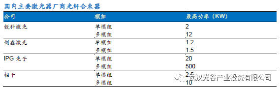 国内合束器供应商有郎光科技、中科汇纤光电等,国外供应商主要有加拿大 ITF、Technologies。目前国内主要激光器制造商锐科与创鑫都已掌握合束器制造核心技术并实现规模化生产,成功实现产品化 12kW 功率光纤激光器,其中锐科单模组最高输出功率 2kW,创鑫最高功率 1.5kW。但是国内厂商在输出功率上与国外龙头公司 Coherent、IPG 等仍有差距,IPG 单模最高 20kW,多模组最高输出功率 500kW;Coherent 单模最高功率 2.5kW,多模最高 10kW。